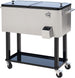 Bring the party with you wherever you go with our portable rolling cooler cart from Out sunny. Made of durable steel with a stylish colored finish, it' the perfect companion to any outdoor gathering. This 80 quart (20 gallon) cooler has two openings so you can easily access both sides and features convenient handles on each side as well. A drainage hole located on the back lets you quickly remove excess water while a convenient bottle opener with cap catcher is attached to the front. It features four wheels which allows you to bring this cooler with you anywhere you go and then keep it in place with two locking wheels. The attached bottom shelf can be used to hold additional accessories such as mixers or cups. Get your summer started right with this versatile rolling cooler from Out sunny and turn your patio from a waste of space to the party place.